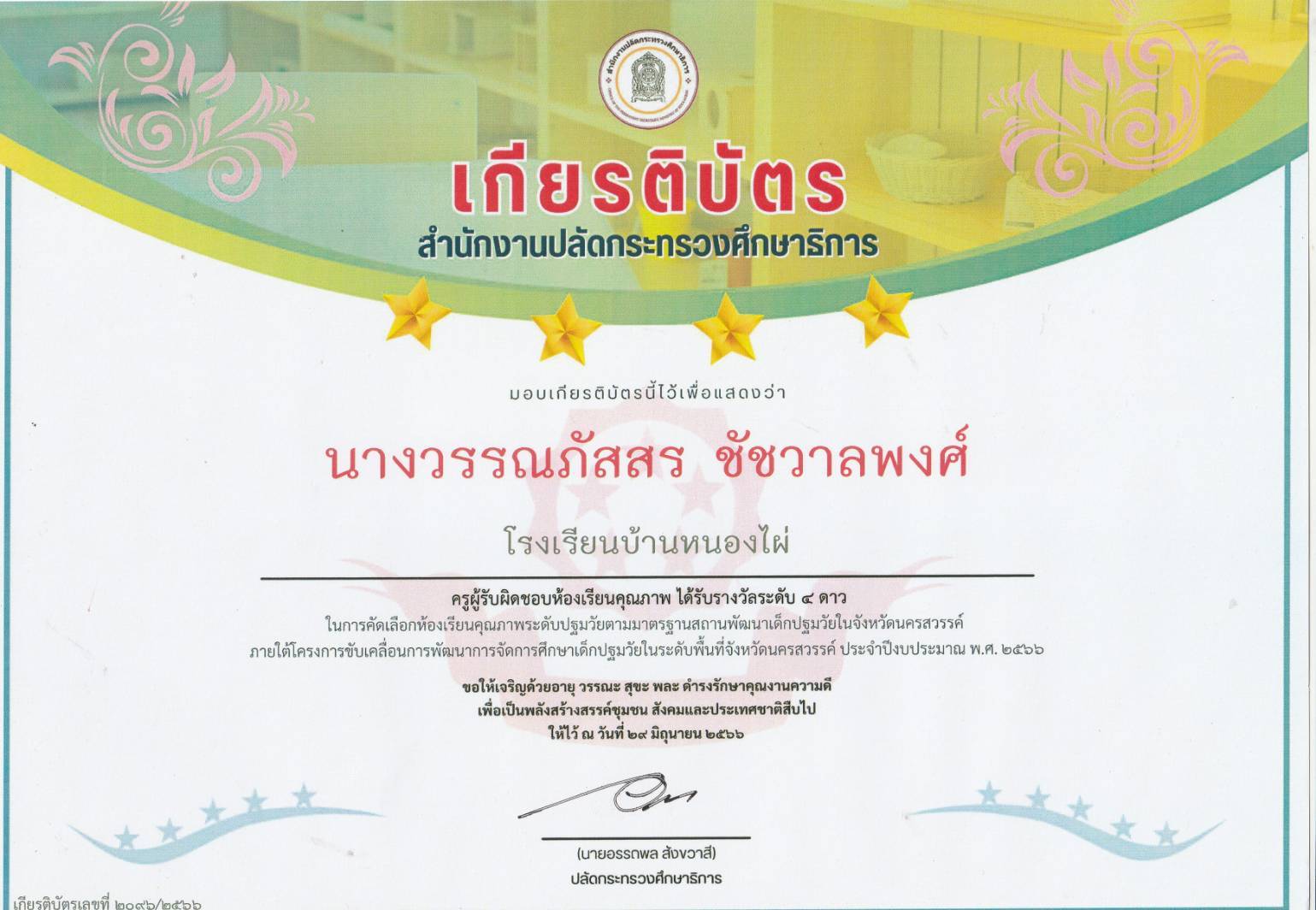 ครูผู้รับผิดชอบห้องเรียนคุณภาพ ได้รับรางวัลระดับ 4 ดาว ในการคัดเลือกห้องเรียนคุณภาพระดับปฐมวัย ตามมาตรฐานสถานพัฒนาเด็กปฐมวัยในจังหวัดนครสวรรค์ |