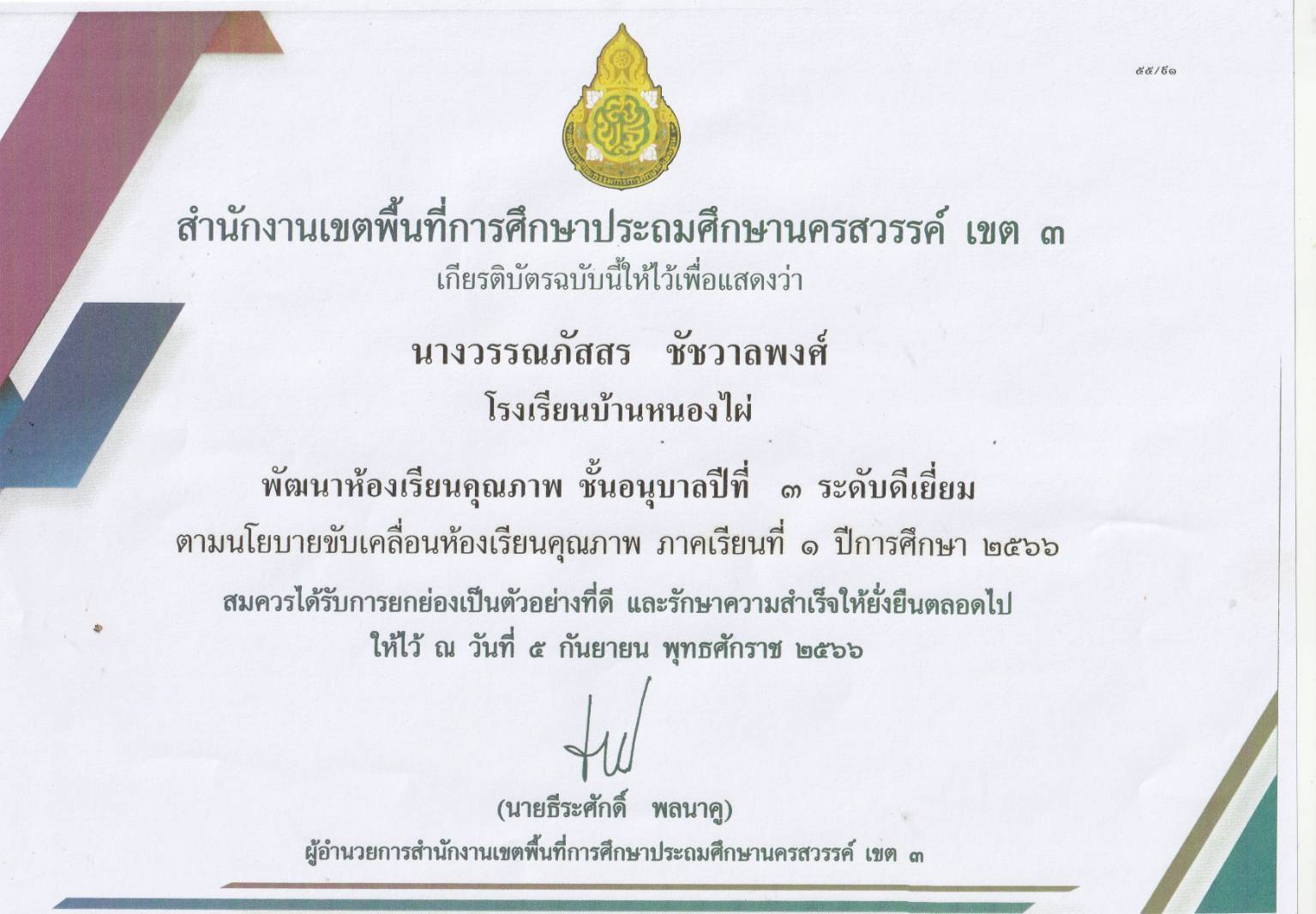 พัฒนาห้องเรียนคุณภาพ ชั้นอนุบาลปีที่ 3 ระดับดีเยี่ยม ตามนโยบายขับเคลื่อนห้องเรียนคุณภาพ ภาคเรีนที่ 1 ปีการศึกษา 2566 |