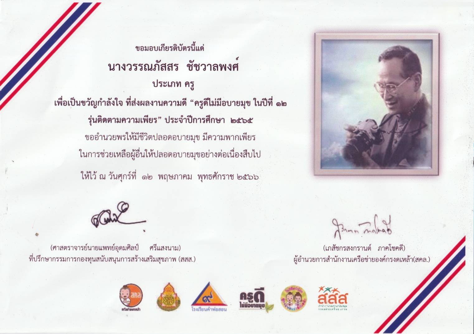 เกียรติบัตรครูดีไม่มีอบายมุข ในปีที่ 12 รุ่นติดตามความเพียร ประจำปีการศึกษา 2565 |