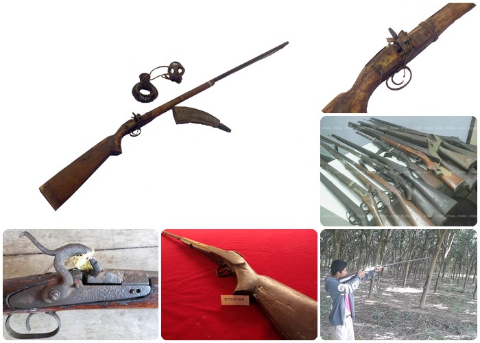 ปืนแก๊ปสมัยโบราณ มีด้ามเป็นไม้ ส่วนไกปืนและกระบอกเป็นโลหะ บรรจุกระสุนและดินปืนตรงปลายกระบอก ต่อมาพัฒนาเป็นปืนลูกซอง ใช้ยิงล่าสัตว์