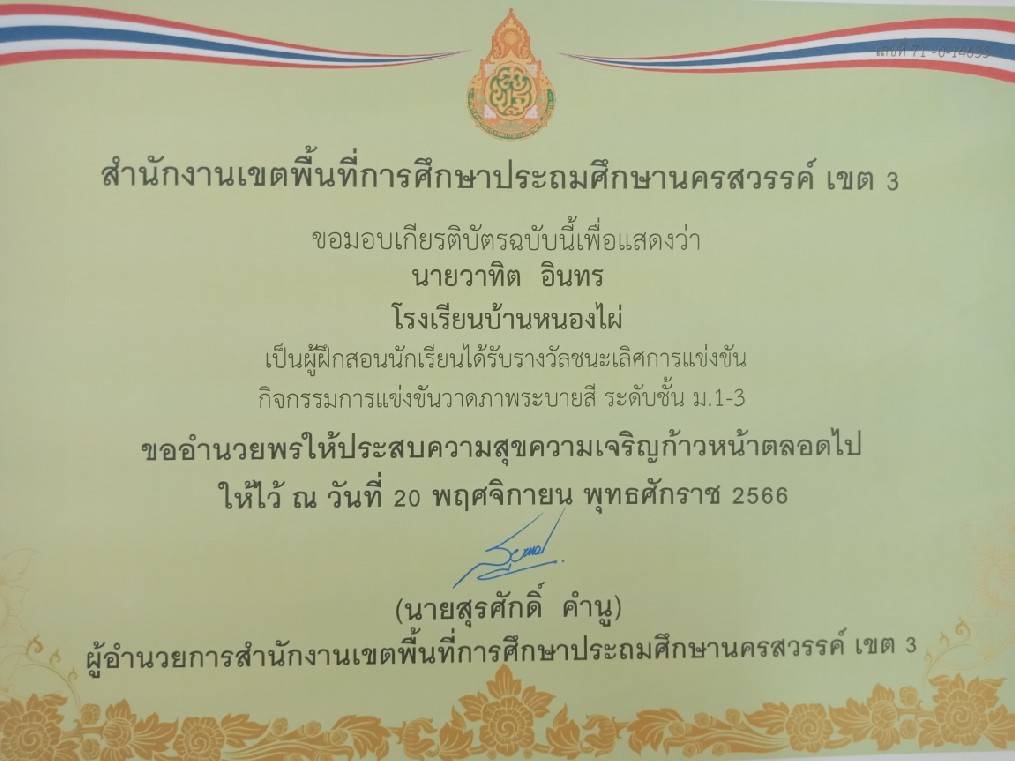 เป็นผู้ฝึกสอนนักเรียนได้รับรางวัลชนะเลิศ การแข่งขันกิจกรรมการแข่งขันการสร้างเกมสร้างสรรค์จากคอมพิวเตอร์ ม.1-3 ระดับเขตพื้นที่การศึกษา ปีการศึกษา 2566 |
